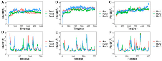 Plots of root mean square deviation (RMSD) and root mean square fluctuation (RMSF) of protein Cα atoms extracted from three independent 500 ns simulations of AT1R–peptide complexes. Data from three independent runs are plotted in blue, green, and red colors. (A) RMSD of AT1R-LVV-H7 complex, (B) RMSD of AT1R-AngII complex, (C) RMSD of AT1R-LVV-H7-AngII complex, (D) RMSF of AT1R-LVV-H7 complex, (E) RMSF of AT1R-AngII complex, and (F) RMSF of AT1R-LVV-H7-AngII complex.