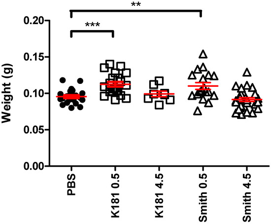 Effect of MCMV infection during pregnancy on placental weight (placental weights of E18.5 fetuses inoculated on day 0.5 or day 4.5 of pregnancy). Female BALB/c mice (n = 5) were infected with 2 × 104 PFU MCMV (K181Perth or Smith strain TCV) or the same volume of phosphate buffered saline (PBS) on the day of fertilization (E0.5) or on the day of blastocyst implantation (E4.5, viruses only) via the intraperitoneal route. Placentae were collected on E18.5 and weights were recorded. Mean ± SD are shown in red. ** p < 0.01. *** p < 0.001, ANOVA, Tukey’s multiple comparison test.