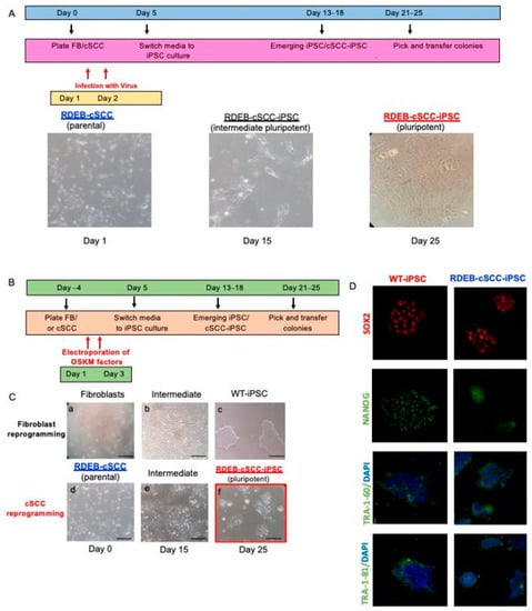 Reprogramming and characterization of reprogrammed RDEB-cSCC cells. (A) Timeline for lentivirus-based method to reprogram RDEB-cSCC into RDEB-cSCC-iPSC. Representative pictures taken throughout the reprogramming method are also shown. (B) Timeline for feeder-free method to reprogram RDEB-cSCC into RDEB-cSCC-iPSC using an episomal plasmid. (C) Morphology of RDEB-cSCC-iPSC derived from RDEB-cSCC compared to WT-iPSC derived from fibroblasts. iPSCs appear to be morphologically similar (small cell shape, large nuclear-to-cytoplasmic ratio, prominent nucleoli, tight and flat colonies). (D) Immunofluorescence staining of stem cells markers in WT-iPSCs and RDEB-cSCC-iPSCs.