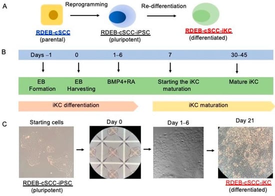 Re-differentiation of RDEB-cSCC into RDEB-cSCC-iKCs. (A) General schematic for reprogramming and re-differentiation methods. (B) Timeline for method to differentiate RDEB-cSCC-iPSC into RDEB-cSCC-iKC. (C) Representative pictures of the differentiation of RDEB-cSCC-iPSC into RDEB-cSCC-iKC.