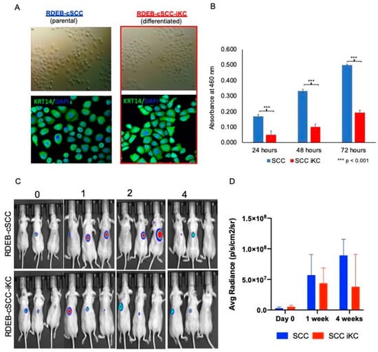 In vitro and in vivo characterization of RDEB-cSCC-iKC. (A) Representative pictures showing the morphological differences between parental RDEB-SCC and re-differentiated RDEB-cSCC-iKC. Keratin 14 (KRT14) is shown in green and nuclei are stained in blue (DAPI) on the representative immunofluorescence pictures. (B) RDEB-cSCC and RDEB-cSCC-iKC cell numbers over 72 h on absorbance at 490 nm measured using the CellTiter 96® AQueous Assay. *** p < 0.001 (C) Bioluminescence signal intensities over a 4-week course for tumor models derived from RDEB-cSCC and RDEB-cSCC-iKC. (D) Average radiance over a 4-week course for RDEB-cSCC and RDEB-cSCC-iKC tumor models.