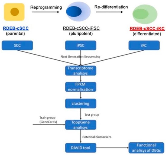 The total RNA was isolated from RDEB-cSCC, RDEB-cSCC-iPSCs and RDEB-cSCC-iKCs according to the manufacturer’s protocol (Qiagen, Hilden, Germany) and RNA-seq was performed at Genewiz, NJ, USA. RNA-Sequencing libraries were prepared by TruSeq Stranded total RNA Library Prep (Illumina Corp., San Diego, CA, USA) according to the manufacturer’s standard protocol. Libraries were sequenced on the HiSeq instrument (Illumina Co., San Diego, CA, USA) following the manufacturer’s protocol. FASTQ-formatted sequences were analyzed for quality control by the FASTQC open-source software. Trimmomatic tool was used to trim raw sequences. Sequences with quality score below 24 were excluded. Then HISAT2 software was used to align reads to the reference genome sequence (hg38). Transcript expression was comprehensively quantified with Cufflinks software, which performed: transcript assembly, quantification of expression as FPKM (fragments per kilobase of transcript per million mapped reads) values, and normalization. Normalized FPKM values were used for downstream analysis steps. Exploratory data analysis was used to cluster the gene expression data. The rank candidate genes were typed from each cluster based on functional similarity to training gene list using machine learning algorithm (ToppGene tool). This list was obtained from publication Cho et al. 2018 (ToppGene tool) [4]. To determine the biological functional processes of the candidate genes, the online tool provided in the DAVID v. 6.8 (Database for Annotation, Visualization, and Integrated Discovery) website was used. A p-value of < 0.05 was used to indicate statistical significance.