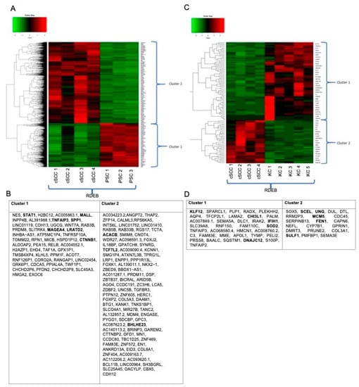 Based on the morphological and functional differences between RDEB-cSCC and RDEB-cSCC-iKCs, we initialized RNA-seq analysis to compare gene expression profiles between these samples (Figure 4). First, we analyzed expression in RDEB-cSCC and RDEB-cSCC-iPSCs. Differential expression analyses showed two clusters including genes with two opposite expression levels in RDEB-cSCC and RDEB-cSCC-iPSC cells (Figure 5A). The first cluster includes genes with higher expression, while the second includes genes with lower expression in RDEB-cSCC-iPSC cells. The ToppGene tool was used to prioritize and rank candidate genes based on functional similarity to the training gene list. The result showed that seven genes in cluster 1 (MALL, STAT1, TNFAIP3, SPP1, MAGEA4, LRATD2, CTNNB1) and three genes in cluster 2 (ACACB, TCF7L2, BHLHE23) are potential RDEB-cSCC-iPSCs differentiation markers (Figure 5B). The output of the Database for Annotation, Visualization, and Integrated Discovery (DAVID) bioinformatics tool revealed that three genes from cluster 1 (CTNNB1, SPP1, STAT1) are members of one metabolic pathway–perinuclear region of cytoplasm (GO:0048471) and no genes from cluster 2. Then we analyzed the expression in RDEB-cSCC and RDEB-cSCC-iKCs. Differential expression analyses showed two clusters including genes with two opposite expression levels in RDEB-cSCC and RDEB-cSCC-iKC cells (Figure 5C). The first cluster includes genes with higher expression, while the second includes genes with lower expression in RDEB-cSCC-iKC cells. The ToppGene tool analysis showed that five genes in cluster 1 (SOD2, KLF12, DNAJC12, IFIH1, CHI3L1) and five genes in cluster 2 (SCEL, FEN1, SULF1, MCM5, UNG) are potential RDEB-cSCC-iKC differentiation markers (Figure 5D). The output of the DAVID bioinformatics tool revealed that three genes from cluster 1 (KLF12, IFIH1, SOD2) are members of the DNA binding metabolic pathway (GO:0003677) and four genes from cluster 2 (CDC45, DTL, FEN1, MCM5) are members of the DNA replication pathway (GO:0006260).