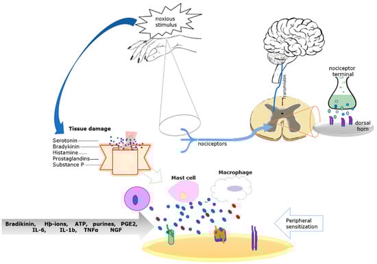 Pain is traditionally defined as a complex sensory and emotional experience associated with actual or potential tissue damage or described in terms of such damage (International Association for the Study of Pain) [1,2,3]. It is a complex process that involves neuronal signaling pathways between the peripheral nervous system (PNS) and the central nervous system (CNS) [1,3]. The transduction of noxious stimuli (those that actually or potentially damage tissues) is carried out by a nociceptor, creating an electrophysiological neuronal signal encoded in the form of an action potential that is transmitted to the CNS. The acute injury is associated with a first, well-localized pain sensation transduced and transmitted by nociceptors. Although pain is one of the body’s most important adaptation and protection mechanisms, the degree of tissue damage leads to the release of inflammatory mediators that bind to its receptors, triggering an enzymatic cascade [1]. Thus, inflammatory pain is generated by an increase in sensitivity due to the cellular response associated with tissue damage, promoting the influx of activated cells such as macrophages, lymphocytes, and mast cells that release inflammatory mediators such as bradykinin, Hþ ions, ATP, purines, prostaglandin E2, leukotrienes, cytokines, nerve growth factor (NGF), sympathetic amines, and oxidative stress products present in the membrane of nociceptors [4] (Figure 1). NGF released by activated macrophages acts directly on peptidergic C fibers that express the TrkA receptor, a key component of peripheral sensitization. Macrophages release cytokines such as interleukin-6 (IL-6), IL-1b, tumor necrosis factor α (TNFα) which in turn contribute to peripheral sensitization through increased local production of proalgesic agents such as bradykinin, prostaglandins and increased release of NGF [1]. Prostaglandins are synthesized by consecutive reactions initiated by the phospholipase A2 enzyme that causes the release of arachidonic acid (AA) from cell membranes. Cyclooxygenase-2 (COX2) metabolizes arachidonic acid to prostaglandin G2 (PGG2) and prostaglandin H2 (PGH2) which is ultimately converted to PGE2 by prostaglandin E synthase (PTGES) [5]. PGE2 acts on all four E-prostanoid (EP) receptor subtypes (EP1-4). In peripheral tissue, PGE2 modulates pain sensitivity by sensitizing primary afferents. Sensitizes ion channels involved in pain, namely transient receptor potential vanilloid 1 channel, tetrodotoxin-sensitive Na+ channels, and purinergic P2X3 channels, also enhances the release of neurotransmitters. So, it is a crucial lipid mediator of inflammatory responses that causes pain hypersensitivity [6].