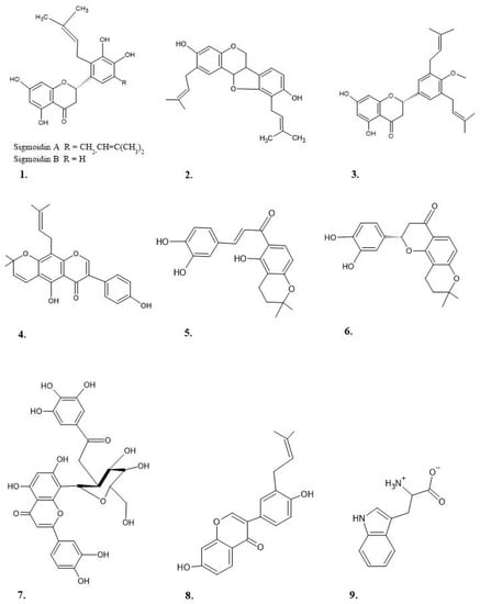 Main chemical structures are involved in the inhibition of the inflammatory process. Sigmoidin A and B (1), Erycristagallin (2), Abyssinone V-4′-methyl ether (3), Waragalone (4), Mildbenone (5), Mildbone (6), 2″-O-galloyl orientin (7), Neobavaisoflavone (8) and Hypaphorine (9). The chemical structures were created with the ACD/ChemSketch Freeware program.