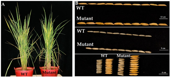 The plant (A) and grain phenotype (B) of wild type (WT) and mutant lines. Seeds were randomly collected from GXU52-3, GXU52-6, and GXU52-8 mutant lines for phenotyping.