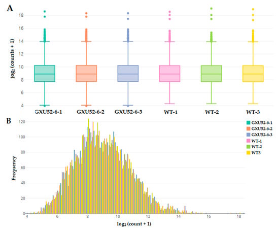 In total, 574,173 spectra were produced from the iTRAQ experiment. We identified 66,313 matched spectra, 26,986 peptides, 4752 total proteins, and 4743 protein after sorting deleting proteins with missing values. The count data distribution by box and whisker plot showed a clear difference between WT and GXU52-6 (Figure 4A). The histogram of protein count data presented that the protein frequency was higher at 6 to 12 of log2 (counts + 1) (Figure 4B). The information about identified peptides and proteins is given in Supplementary file 2.
