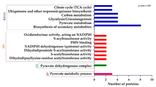 Gene ontology (GO) and KEGG (Kyoto Encyclopedia of Genes and Genomes) analysis and was performed to assess the different functions of DEPs. The GO terms regarding “biological process (BP)”, showed that DEPs related to pyruvate metabolic process were significantly regulated. Regarding “cellular component (CC)”, proteins were only associated with pyruvate dehydrogenase complex were enriched. Finally, from the “molecular function (MF)” perspective, proteins involved in dihydrolipoyllysine-residue acetyltransferase activity, s-acetyltransferase activity, dihydrolipoamide s-acyltransferase activity, NAD(P)H dehydrogenase (quinone) activity, FMN binding, s-acyltransferase activity, and oxidoreductase activity, acting on NAD(P)H were sufficiently regulated. The KEGG pathway analysis showed that DEPs were involved in the biosynthesis of secondary metabolites, pyruvate metabolism, glycolysis/gluconeogenesis, carbon metabolism, ubiquinone and other terpenoid-quinone biosynthesis, and citrate cycle (TCA cycle) (Figure 5).