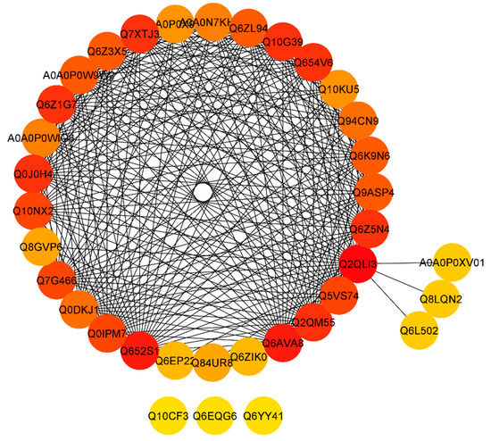 STRING software predicted protein to the protein network of differentially expressed proteins (DEPs). Differentially accumulated proteins are represented by a node, whereas the different color of lines represents evidence for the predicted functional relationship. The strong interaction is indicated by redder color. The proteins outside the circle showed no or weak interaction.
