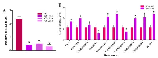 The internal reference gene Actin was used for the normalization of expression between samples. The results exhibited that the GW8 expression was significantly reduced in mutant lines as compared to WT (Figure 7A). To validate the results of the proteomic experiment in total, ten random genes were randomly selected encoding two downregulated proteins including betaine aldehyde dehydrogenase 2 (OsBADH2) and glycosyltransferase (Os02g0589400), and eight up-regulated proteins including, probable pyruvate, phosphate dikinase regulatory protein (PDRP1), cold shock domain protein 2 (CSP2), pyruvate, phosphate dikinase 1 (OsPPDKB), pyruvate dehydrogenase E1 component subunit alpha-1 (Os02g0739600), acetyltransferase component of pyruvate dehydrogenase complex (Os06g0105400), dihydrolipoamide acetyltransferase component of pyruvate dehydrogenase complex (Os12g0182200), probable tocopherol O-methyltransferase, chloroplastic (Os02g0701600), and cell differentiation protein rcd1 (Os03g0784800). The RT-qPCR results represent that the expression pattern of selected genes was correlated with the mass-spectrometry data (Figure 7B).