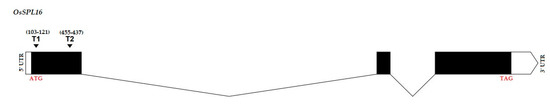 Location of both single guiding RNAs (sgRNAs) in OsSPL16 gene. T1 and T2, represent first and second target sites, respectively. The black boxes represent codon regions.