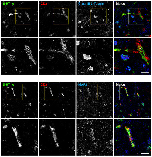 Expression of the 5-HT1A receptor in the microvascular endothelial and perivascular cells of the normal human prefrontal cortex (PFC). Confocal images of the normal PFC gray matter stained for 5-HT1A and CD31 together with either class III β-tubulin or microtubule-associated protein 2 (MAP2). Scale bars, 50 µm.