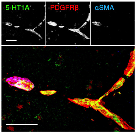 The receptors 5-HT1A and 5-HT1B are expressed in postsynaptic and presynaptic neurons of the PFC, respectively [28,29,30]. In the present study, we showed, by immunofluorescent staining using post-mortem human brain tissue, that the 5-HT1A receptor was also expressed in microvascular endothelial and mural cells of the normal PFC gray matter. Unpredictably, the immunoreactive signal intensity of 5-HT1A in the brain microvascular cells was stronger rather than that in the brain parenchyma. Analysis of a larger number of cases would be required to draw more solid conclusions about an abundance of 5-HT1A in normal brain microvascular cells. Concerning the expression of 5-HT1 members in pericytes, it should be noted that the expression of 5-HT1B receptors is induced in rat pericytes after a spinal cord injury [31].
