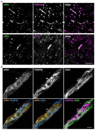 We subsequently verified which types of microvascular cells in the schizophrenic PFC showed aberrant PKA activation. A strong pPKA signal was detected in the PDGFRβ-expressing mural cells (Figure 3A,B). In addition, pPKA was also colocalized with the endothelial marker CD34. Moreover, a weak pPKA signal was at least partially colocalized with glial fibrillary acidic protein (GFAP)-expressing glia.