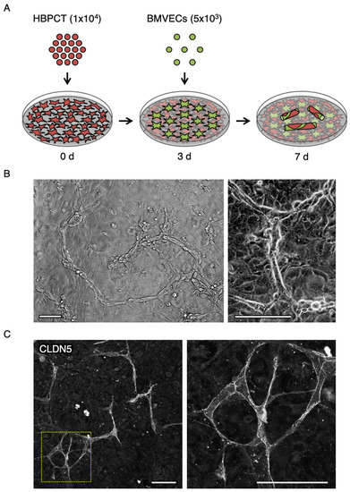Formation of brain microvascular endothelial cell–pericyte tubes in two-dimensional co-culture. (A) Schematic method for two-dimensional co-culture system. HBPCT: human brain-derived pericyte cell line; BMVECs: human primary brain microvascular endothelial cells. (B) Phase-contrast micrograph showing tube-like structure. (C) Confocal images of two-dimensional co-culture stained for CLDN5. Scale bars, 100 µm.