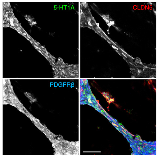 Expression of the 5-HT1A receptor in the human brain microvascular endothelial cell–pericyte tube-like structure in vitro. Confocal images of two-dimensional co-culture stained for HT1A, CLDN5, and PDGFRβ. Scale bar, 50 µm.