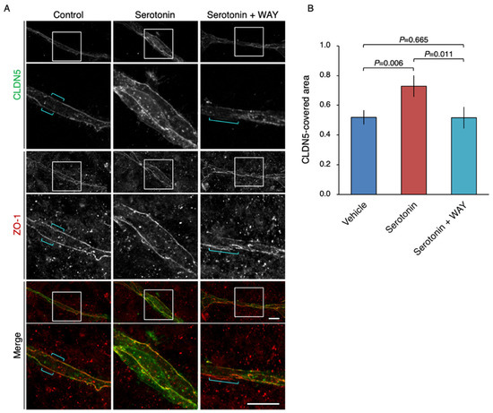 Using the novel two-dimensional co-culture system, we subsequently validated whether serotonin regulated endothelial CLDN5 expression. In the vehicle-treated co-culture, the CLDN5-positive signal was focally diminished, whereas another tight-junction marker ZO-1 displayed a linear expression pattern (Figure 6A). Focal loss of CLDN5 was prevented by the treatment of co-culture with serotonin. The 5-HT1A antagonist WAY reversed the effect of serotonin on endothelial CLDN5 expression. The significant changes in the CLDN5-covered area were shown by quantitative analysis (Figure 6B). Hence, the serotonin/5-HT1A signal in brain microvascular endothelial cells and pericytes appeared to induce endothelial CLDN5 expression.