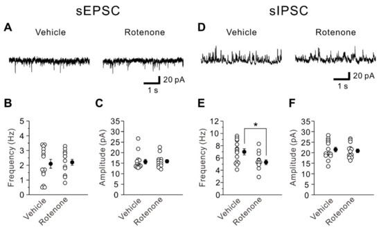 2.3. Intranasal Administration of Rotenone Affects Inhibitory Synaptic Transmission