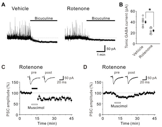 2.4. The Intranasal Administration of Rotenone Reduces Tonic GABA Currents and Activation of GABAA Receptors Restores LTD in Rotenone-Treated Mice