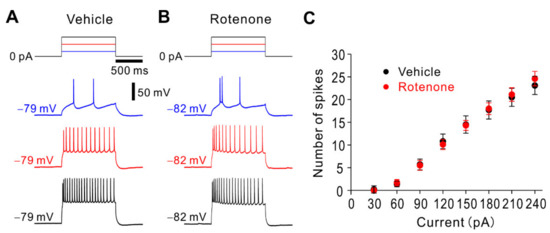 - Huang, C.-W.; Lin, K.-M.; Hung, T.-Y.; Chuang, Y.-C.; Wu, S.-N. Multiple Actions of Rotenone, an Inhibitor of Mitochondrial Respiratory Chain, on Ionic Currents and Miniature End-Plate Potential in Mouse Hippocampal (mHippoE-14) Neurons. Cell. Physiol. Biochem. 2018, 47, 330–343. [Google Scholar] [CrossRef]