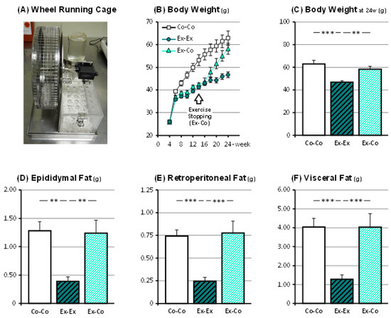 The running wheel cage (A), changes in body weight (B,C), and visceral fat weights, epididymal fat (D), retroperitoneal fat (E), visceral fat (F). Co-Co: sedentary control. Ex-Ex: 20-week exercise. Ex-Co: 10-week exercise followed by 10-week sedentary condition groups. Data are represented as mean ± SEM. **: p < 0.01, and ***: p < 0.001.