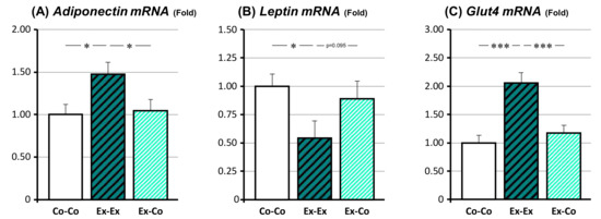 The changes in the mRNA expression of adipokine-related genes, adiponectin and leptin, and the major glucose transporter in adipose tissue, Glut4, were investigated (Figure 2). The Ex-Ex group’s adiponectin mRNA expression was significantly higher than that of the Co-Co and Ex-Co groups (p < 0.05 for both comparisons), but no significant difference was found between the Co-Co and Ex-Co group. On the other hand, the Ex-Ex group’s leptin mRNA expression was lower compared to those of the Co-Co and groups (p < 0.05); but no significant difference was found between the Co-Co and Ex-Co group. The Glut4 mRNA expression of the Ex–Ex group was significantly higher than that of the Co-Co, and Ex-Co groups (p < 0.001, respectively), but no significant difference was found between the Co-Co and Ex-Co group.