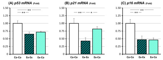 The changes in mRNA expression of senescence-related genes, such as p53, p21, and p16, were investigated (Figure 3). The p53 and p16 mRNA expressions of the Ex-Ex and Ex-Co groups were significantly lower than those of the Co-Co group (p < 0.01, respectively), but there was no significant difference between the Ex-Ex and Ex-Co groups. On the other hand, the Ex-Ex group’s p21 mRNA expression was significantly lower than that of the Co-Co group (p < 0.01). The Ex-Co group’s p21 mRNA expression showed the tendency to revert to the Co-Co group condition, and therefore, there was a significant difference between the Ex-Ex and Ex-Co groups (p < 0.05).