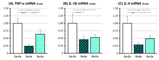The changes in mRNA expression of the genes associated with SASP, i.e., TNF-α, IL-1β, and IL-6, were examined (Figure 4). The TNF-α mRNA expression of the Ex-Ex group was significantly lower than that of the Co-Co group (p < 0.001). The TNF-α mRNA expression of the Ex-Co group, showed the tendency to revert to the Co-Co group condition (p = 0.051 between the Ex-Ex and Ex-Co groups and p = 0.079 between the Co-Co and Ex-Co groups). The IL-6 mRNA expression of the Ex-Ex and Ex-Co group was significantly lower than that of the Co-Co group (p < 0.01 and p < 0.05, respectively), but there was no significant difference between the Ex-Ex and Ex-Co group. The IL-1β mRNA expressions of the Ex-Ex and Ex-Co groups showed the tendency to decrease compared to the Co-Co group, but no significant difference between the three groups.