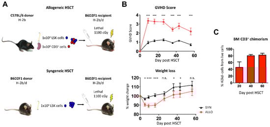 (A) Overview of the experimental hematopoietic stem cell transplantation protocol: allogeneic setting and syngeneic setting. (B) Clinical data of syn- and allo-HSCT mice (syn N = 19, allo N = 21). (C) Chimerism analysis of BM CD3+ cells in allo-HSCT mice (N = 6–7 per date). Error bars indicate mean ± SEM; * p ≤ 0.05; *** p ≤ 0.001; n.s. not significant by unpaired Student’s T-test.