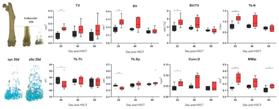 To identify changes in the bone substance we performed microCT analyses of the bones after HSCT. We found distinct differences in the trabecular bone structure between allo-HSCT and syngeneic HSCT (syn-HSCT) recipients (Figure 2). Allo-HSCT led to higher bone volume in the trabecular area and to higher trabecular numbers compared to the syn-HSCT group at day +20 post transplantation. Significantly higher trabecular numbers were accompanied by significantly lower trabecular separation and increased connectivity between trabecular structures while the trabecular thickness had decreased, indicating a de novo formation of trabecular branches. The volumetric isolated polar moment of inertia significantly increased due to higher branching of trabecular structures (Figure 2). Strikingly, these changes occurred in a relatively short time period till day +20 after allo-HSCT (Figure 2).