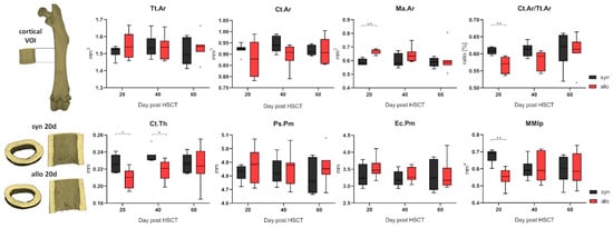Analyzing the cortical bone in the diaphyseal midshaft of the femora of allo-HSCT recipients at day +20 post transplant revealed a significant change in the medullary cavity indicating bone remodeling (Figure 3). The larger medullary area was accompanied with a significantly thinner cortical bone in allo-HSCT as compared to syn-HSCT recipients, and this cortical thinning resulted to a significantly lower ratio of cortical to total bone area in the diaphyseal femoral bone and to a significant decrease in the polar moment of inertia. These structural changes indicate major remodeling processes in bone quality and quantity in the early phase after allo-HSCT and could be speculated as an assignable influencing factor for the increased fracture rates post-transplantation observed in patients in the early phase after allo-HSCT.