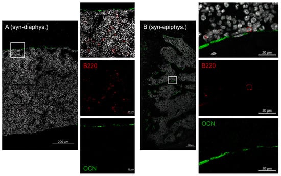 In order to analyze the distribution of B cells and osteoblasts, harvested bones were cryo-embedded according to the Kawamoto method [47]. Bones were fixated in 4% PFA solution for 4h at room temperature before they went through increasing sucrose solutions (10%, 20%, 30%) for 24 h each at 4 °C. Consequently, bones were embedded in SCEM (SectionLab, Hiroshima, Japan) in pre-cooled n-hexane and were kept at −80 °C. Then, thin serial sections of 7 µm were created with a cryostat (Leica, Wetzlar, Germany). Immune-histological analysed frozen sections were thawed and rehydrated in PBS for 20 min. Followed by blocking for 1h with wash buffer (1X TBS + 5% FCS + 0.1% Tween-20) plus 10% donkey serum and subsequently stained with anti-osteocalcin (Enzo Life Sciences, Lörrach, Germany, final dilution 1:4000 for 1 h at room temperature). After washing, the donkey anti-rabbit AF647 antibody (BioLegend, San Diego, CA, USA) was applied for 1 h, followed by washing and blocking with wash buffer containing 10% rat serum for 1 h. Next, the anti-B220 antibody (in house production of the Deutsches Rheuma-Forschungszentrum, Berlin, Germany) was applied for B cell detection. Using DAPI to stain the cell nuclei (1:1000) for 7 min at room temperature the staining was finalized with a washing step in PBS before embedding. As control for the B cell staining, femora were stained without the inclusion of the anti-B220 antibody and as control for the osteoblast staining, the anti-osteocalcin antibody was omitted, and femora were only stained for the secondary antibody (see Supplementary Figure S2).