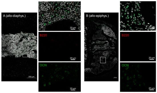 Femora harvested at day +20 after allo-HSCT were prepared for immunohistochemistry (N = 6). Within the diaphysis of the femora ((A) allo-diaphys.) no osteocalcin positive lining cells were detected within the endosteal region and B cells were absent from the BM cavity. Of note, osteoblasts were found evenly distributed throughout the BM space. The same result was true for the epiphyseal bone ((B) allo-epiphys.). Nuclei (Dapi = white, 2nd outtake image from top to bottom), B cells (B220 = red, single stain 3rd outtake image from top to bottom), osteoblasts (osteocalcin = green, single stain 4th outtake image from top to bottom). Representative images are shown.