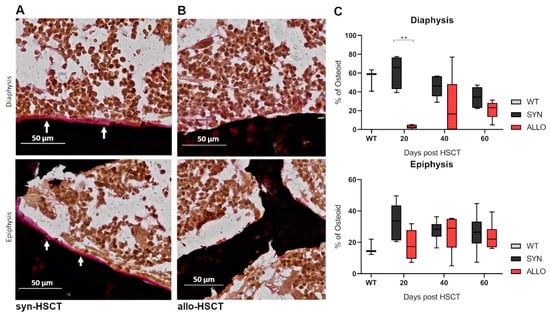 Syn-HSCT recipients showed a lining of osteoid in the endosteal region of the diaphyseal and epiphyseal region of the bone (Figure 6A). In contrast, osteoid lining in the endosteal region of the diaphyseal bone was significantly reduced in allo-HSCT recipients (Figure 6B,C).