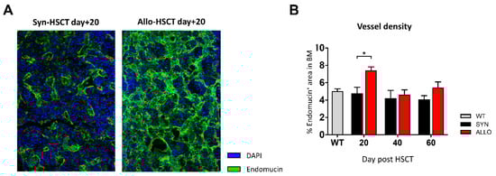 (A) Representative pictures of BM sections stained with Endomucin (green) on day +20 after HSCT. Nuclei were counterstained with Dapi (blue). (B) Analysis of vessel density in the BM of BDF syn- and allo-HSCT mice (WT N = 3, syn N = 7, allo N = 6). Error bars indicate mean ± SEM; * p ≤ 0.05 by unpaired Student’s T-test.