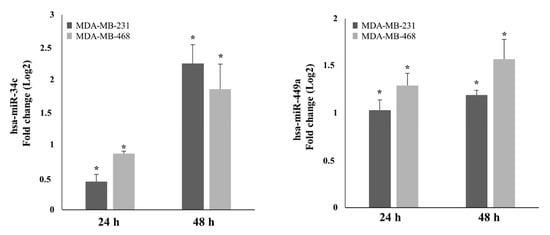 To obtain insight into the functional mechanism underlying AdoMet’s anticancer effects in TNBC cells, we evaluated its ability to induce the expression of miR-34c and miR-449a by performing quantitative real-time PCR (qRT-PCR) analysis with pre-designed probe-primer sets after 24- and 48 h treatment of MDA-MB-231 and MDA-MB-468 cells with 500 µM AdoMet. The results obtained showed that the relative expression of the two miRNAs was up-regulated by AdoMet in both TNBC cell lines. As shown in Figure 1, after 48 h, miR-34c expression was up-regulated about 2.25-fold and 1.85-fold in MDA-MB-231 and MDA-MB-468 cells, respectively, while the miR-449a level resulted approximately about 1.19-fold and 1.57-fold higher than the corresponding untreated cells. The observed AdoMet-induced up-regulation of miR-34c and miR-449a clearly highlighted the ability of the sulfonium compound to reprogram the expression of non-coding miRNA-34/449 superfamily in TNBC.