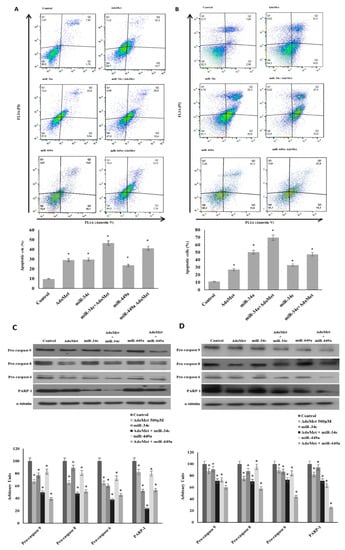 To explore the antitumor activity of AdoMet in TNBC cells, we first tested the ability of the sulfonium compound to induce apoptosis in MDA-MB-231 and MDA-MB-468 cells. The cells were treated with AdoMet 500 µM and the apoptotic process was evaluated after 72 h by flow cytometry. As shown in Figure 2A,B, treatment with AdoMet resulted in increased accumulation of apoptotic cells in both TNBC cell lines compared to controls accompanied by reduced levels of pro-caspase-8 and -9 which are initiator caspases of the extrinsic and intrinsic apoptotic pathways, respectively, and pro-caspase 6, an executioner caspase (Figure 2C,D). AdoMet-induced activation of caspase cascade was further highlighted by the cleavage of poly (ADP-ribose) polymerase (PARP), a known marker of cells undergoing apoptosis. These findings indicated that AdoMet could effectively induce apoptosis in MDA-MB-231 and MDA-MB-468 cells via activation of caspase signaling pathway. To evaluate whether the AdoMet-induced upregulation of miR-34c and miR-449a was involved in the antiproliferative effect exerted by AdoMet in MDA-MB-231 and MDA-MB-468 cells, we performed transfection experiments with either miR-34c or miR-449a mimics and we evaluated the modulation of apoptotic cell death in AdoMet-treated and untreated cells using flow cytometry-based Annexin V/propidium iodide (PI) assay.