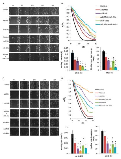 Cell migration was detected in real-time by using video time-lapse microscopy (TLVM), and representative images of the wound closure process are shown in Figure 3A,C for MDA-MB-231 and MDA-MB-468 cells, respectively. We found that, in both cell lines, a qualitatively higher closure of the wound in control respect to AdoMet-treated samples occurred indicating, first of all, that the sulfonium compound inhibited the motility of TNBC cells. When both cell lines were transfected with miR-34c or miR-449a mimics the wounds closed more slowly in AdoMet-treated than in AdoMet-untreated cells demonstrating that the sulfonium compound exerted a synergistic effect with both miRNAs in reducing cell motility over the entire time interval.