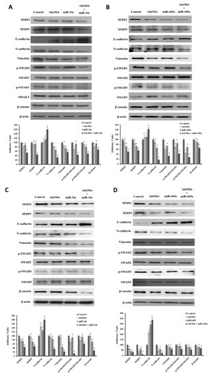 Effect of AdoMet/miR-34c and AdoMet/miR-449 combination on the levels of migration- and EMT-related proteins in MDA-MB-231 and MDA-MB 468 cells. MDA-MB 231 and MDA-MB 468 cells were transfected with 100 nM miR-34c or miR-449a supplemented or not (Control) with 500 μM AdoMet for 48 h. The levels of MMP2, MMP9, Vimentin, N-cadherin, E-cadherin, p-SMAD2, SMAD2, p-SMAD3, SMAD3, and β-catenin were detected by Western blot analysis using the total cell lysates of MDA-MB-231 (A,B) and MDA-MB 468 (C,D). The densitometric analysis was reported. Data are reported as percentage of protein expression of untreated control (100%). For the equal loading of protein in the lanes, β-actin was used as a standard. The images are representative of three immunoblotting analyses obtained from at least three independent experiments. The intensities of signals were expressed as arbitrary units. * p < 0.05 versus untreated cells (Control). Uncropped images of Western blots are reported in Figures S2 and S3.
