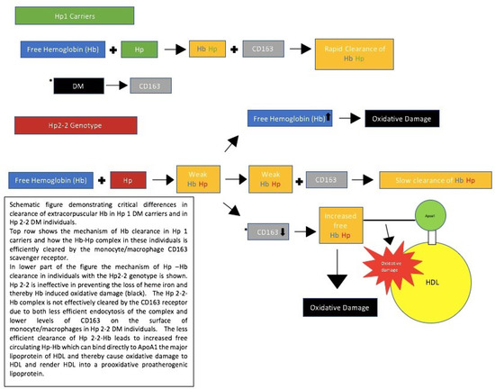 The studies presented in Table 1 demonstrate that DM patients with the Hp2-2 genotype have an up-to-five-time increased risk of CVD compared to DM individuals with the Hp1-1 genotype, while Hp2-1 individuals have an intermediate risk [14]. The mechanism whereby the Hp genotype confers a risk for CVD is a direct consequence of the differences in function between Hp proteins resulting from the different Hp genotypes. The function of Hp is to bind to Hb that is released during intravascular destruction of erythrocytes (approximately 6 g of Hb per day). This extracorpuscular “free” Hb is a potential important oxidant, and the binding of Hp to free Hb prevents, in large part, the oxidative action of Hb [25]. The monocyte/macrophage receptor CD163 binds the Hp–Hb complex, thereby clearing extracorpuscular, free Hb from the blood [26]. However, the Hp 2-2 protein is deficient in its ability to prevent Hb-induced oxidation and in its ability to promote the clearance of Hb–Hp by the CD163 receptor. These deficiencies result in greater oxidative stress in Hp 2-2 individuals, which is further enhanced in the setting of DM due to the ability of DM to potentiate the oxidative potential of Hb and to downregulate CD163 expression, as shown in Figure 1 [27,28,29]. As a result of the impaired clearance of Hp–Hb 2-2 complexes in DM patients, there is an increased concentration of Hp–Hb in Hp 2-2 DM individuals, which allows the complex to associate with other plasma proteins to which it normally does not bind (such as low-density lipoproteins (HDL)) [30]. Hp can bind directly to ApoA1, the major apolipoprotein of HDL, and thereby tether Hb to which it is complexed to HDL. This tethering transforms the normally antiatherogenic and antioxidative HDL particle into a proatherogenic prooxidative dysfunctional HDL particle, due to its Hb cargo, [3,31].