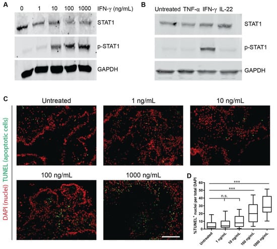 HIOs were incubated under similar concentrations of IFN-γ, as described above, for a longer duration of three days to assess if such concentrations resulted in increased apoptosis. Terminal deoxynucleotidyl transferase dUTP nick-end labeling (TUNEL) revealed no significant increase in the number of apoptotic cells in HIOs treated with 1 ng/mL or 10 ng/mL of IFN-γ compared to untreated controls. However, HIOs incubated with 100 ng/mL and 1000 ng/mL exhibited a significant increase in TUNEL-positive cells (Figure 1C,D). Given that exposure of HIOs to 10 ng/mL of IFN-γ gave robust p-STAT1 yet did not result in significantly increased cell death, all future experiments were conducted with this concentration.
