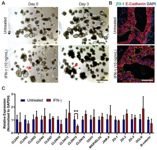 HIOs were grown for 70 days under standard culture conditions and subsequently incubated with 10 ng/mL IFN-γ for 3 and 6 days. After exposure to IFN-γ for 3 days, organoids appeared smaller and darker (Figure 2A) with the collapse of some cystic-like organoids into more convoluted structures (Figure 2A, red arrowheads) that was not apparent in untreated controls. It has previously been reported that IFN-γ can affect intestinal permeability by altering the expression or eliciting the mislocalization of tight junctions and adherens junctions in intestinal epithelial cell lines [18,19]. Upon examination, we found no mislocalization of the tight junction protein ZO-1 or the adherens junction protein E-Cadherin in IFN-γ-treated HIOs, which appeared indistinguishable from untreated controls at the microscopic level using these markers (Figure 2B). We next analyzed by quantitative PCR (qPCR) the expression levels of a suite of genes encoding various junctional proteins to determine if any changes occurred at the transcriptional level in response to IFN-γ treatment. With the exception of a decrease in CLDN15 expression, we found no significant difference in gene expression levels between IFN-γ-treated and untreated HIOs (Figure 2C).