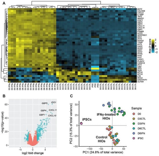 We next performed differential gene expression analysis between untreated and treated HIOs to determine which genes are regulated by IFN-γ. Of the 41,181 probes detected on the Illumina HumanHT-12 v4 BeadChip, 16,113 met our filtering criteria. Of these, 4959 were determined to be differentially expressed between the control and IFN-γ treated groups (Benjamini–Hochberg false discovery rate adjusted p < 0.05) with 326 genes differentially expressed by a log2 fold change ≥ ±1.2 and adjusted p-value < 0.05 (Figure 3B). The majority of these genes were determined to be upregulated in IFN-γ-treated versus controls (237 upregulated, 89 downregulated). Principal component analysis (PCA) using all genes meeting the filtering criteria separated iPSCs from HIOs along principal component 1 (PC1), which represents 24.8% of the total variance in the data (Figure 3C). Separation along PC1 is largely driven by the enrichment of pluripotency genes in iPSCs such as POU5F1, NANOG, LIN28A, and SOX2, which are the top genes in the PC1-negative direction; and enrichment of intestinal genes such as CDX2, OLFM4, KLF5, CEACAM, TFF, and MUC genes which represent the top genes in the PC1-positive direction enriched in HIOs. PC2 separates IFN-γ-treated HIOs from untreated controls, with day 3 and day 6 HIOs being interspersed throughout each treatment cluster (Figure 3C), again suggesting minimal differences between day 3 and day 6 timepoints.