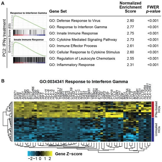 To gain insight into the many differentially expressed genes discovered using our microarray-based gene expression approach, we performed gene set enrichment analysis (GSEA). This approach focuses on finding enrichment of gene expression changes in pathways or gene sets that may not be easily apparent from single-gene analysis [20]. Using this method, we examined pathways associated with the separation of IFN-γ-treated and untreated HIOs along PC2 (Figure 3C). Using the ranked gene loadings from PC2, we performed GSEA against the complete set of gene ontology (GO) terms associated with biological process, molecular function, and cellular component. Pathways related to immune response and interferon signaling were enriched in the positive gene loadings along PC2, which are associated with IFN-γ-treated HIOs (Figure 4A). One of the most highly enriched gene sets was “GO: Response to Interferon Gamma”, with a normalized enrichment score of 2.77 and family-wise error rate (FWER) of p < 0.001, providing some validation of iPSC-derived HIOs as a suitable platform for modeling response to IFN-γ. Analysis of the leading edge genes responsible for the enrichment of “GO: Response to Interferon Gamma” revealed that these genes are highly upregulated in IFN-γ-treated HIOs and contain many known IFN targets and immune-related human leukocyte antigen (HLA) encoding genes (Figure 4B).