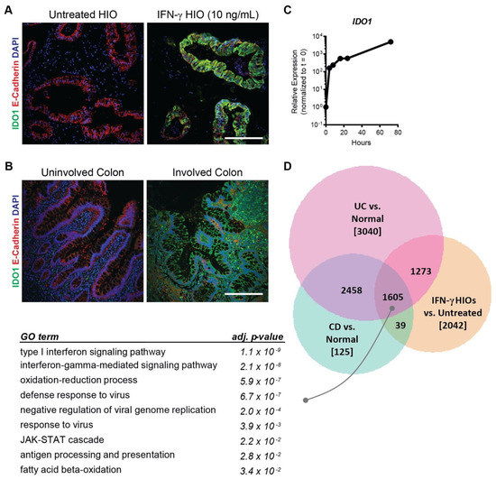 While both iPSC- and biopsy-derived HIOs are increasingly being used to model responses to various cytokines and microbes [8,9], the goal of this study was to thoroughly characterize the effect of the pro-inflammatory cytokine interferon-gamma (IFN-γ) on iPSC-HIOs. IFN-γ was chosen for this study as it is known to be upregulated in IBD [10], its signaling transduction via phosphorylation of STAT1 (p-STAT1) is well described [11], and genes upregulated in other IFN-γ treated intestinal epithelial models have been identified [12,13,14]. Here, we demonstrate that our iPSC-derived organoid system is biologically responsive to IFN-γ, and that short-term exposure causes phosphorylation of STAT1. More prolonged exposure to IFN-γ causes upregulation of known IFN-γ target genes and identification of other previously unreported genes that are regulated by IFN-γ in the intestinal epithelium. Further exploration of the most significantly upregulated gene, indoleamine 2, 3-dioxygenase (IDO1), shows this gene is quickly upregulated following IFN-γ exposure and remains highly elevated throughout the duration of IFN-γ treatment. Analysis of tissue sections reveal that IDO1 is highly expressed in IFN-γ treated organoids and in involved colonic regions of patients with active Crohn’s disease. These results indicate that iPSC-derived HIOs are a suitable model to study the intestinal epithelial inflammatory response and further validate the approach of using this system to examine the effects of various stimuli associated with gastrointestinal disorders such as IBD.