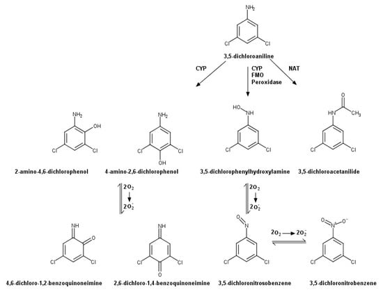 Proposed Biotransformation Pathway of 3,5-DCA. Abbreviations: CYP = Cytochrome P450, FMO = Flavin-containing Monooxygenase, NAT = N-acetyltransferase.