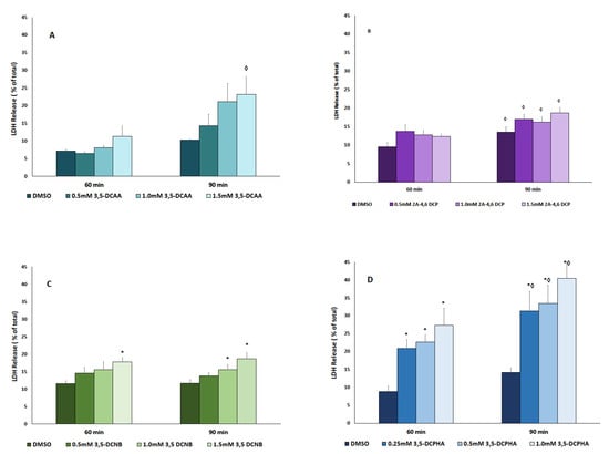 Cytotoxicity induced by 3,5-DCAA (A), 2-A-4,6-DCP (B), 3,5-DCNB (C) or 3,5-DCPHA (D) following exposure for 60–90 min. Each bar represents the mean ± S.E.M. for N = 4–5 separate isolation experiments. * Significantly different from DMSO control, p < 0.05. ◊ Significantly different from 60 min value, p < 0.05.