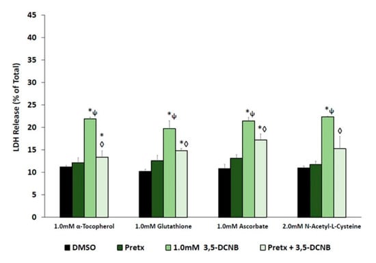 Since anilines and nitrobenzenes can be metabolized to each other, further studies were designed to explore the role of renal biotransformation and free radicals in cytotoxicity following exposure to 1.0 mM 3,5-DCNB for 60 min. To determine the potential role of free radicals in 3,5-DCNB cytotoxicity, IKC were pretreated with an antioxidant. Pretreatment with all antioxidants (α-tocopherol, glutathione, ascorbate, and N-acetyl-L-cysteine; Figure 3) significantly attenuated 3,5-DCNB-induced cytotoxicity.