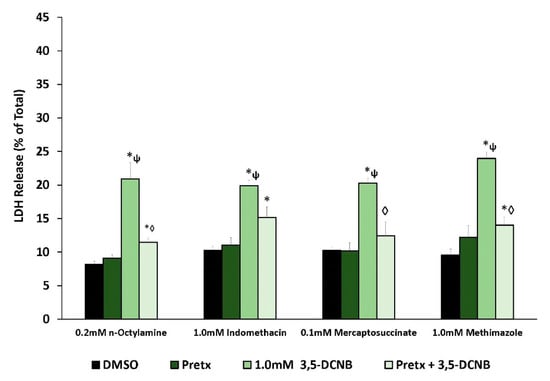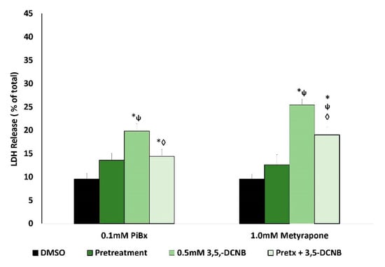 To determine the role of renal biotransformation in 3,5-DCNB cytotoxicity and free radicals in 3,5-DCPHA nephrotoxicity, IKC were pretreated with either an antioxidant or an inhibitor of biotransformation enzyme systems (Table 4) or vehicle (30 µL DMSO) prior to exposure to 1.0 mM 3,5-DCNB (60 min) or 0.5 mM 3,5-DCPHA (60 min). All concentrations and pretreatment times of the antioxidants and renal enzyme inhibitors were based on previously published studies [,].