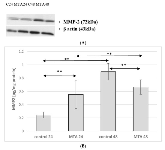 MMP-2 protein expression in monocytes. (A) Representative enzyme protein expression (70 kDa) normalized to β-actin determined by Western blotting method was shown (B) ELISA method analysis of enzyme protein (B) in monocytes was shown. Cells were cultured with mineral trioxide aggregate MTA Repair HP for 24 h (MTA24) and 48 h (MTA48) in RPMI medium with 10% FBS. Following the incubation period, the cells were scraped and protein concentration was measured. The control cells were incubated in RPMI medium with the addition of 10% FBS for 24 h constituting the control 24 (C 24) or for 48 h—control 48 (C 48). The experiments were conducted as three separate assays. ** statistically significant differences vs. control group, p ≤ 0.001; (U–Mann Whitney test).
